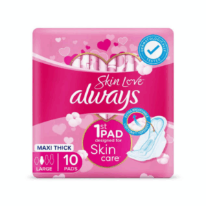 Always?Skin?Love?Maxi?Thick Sanitary Pads (10?pads) are the first-ever pads from Always designed with skincare in mind?offering a soft, cotton-like topsheet for a cushiony feel that pampers sensitive skin while maintaining full protection. Innovative air-tunnel technology promotes exceptional breathability, helping to reduce moisture and stuffiness, while fast-absorption fibers lock away liquid quickly to deliver leak-free comfort throughout the day. These thick, large maxi pads come with wings and provide up to 8?12 hours of reliable protection, making them ideal for moderate to heavy flow