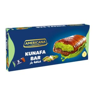 Americana Premium Kunafa Bar Pistachio blends Middle Eastern tradition with modern indulgence. Each 35g bar features a crisp kunafa shell filled with creamy pistachio and coated in smooth chocolate. This 5-piece box offers a generous fusion dessert perfect for gifting, sharing, or elevating your snack game.