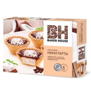 Baker House Coconut Mini Tarts feature a crisp golden crust filled with juicy coconut cream and topped with rich chocolate glaze and shredded coconut. This 6-piece box offers a classic Russian dessert experience, perfect for gifting, impulse buys, and chilled dessert bundles. Packaged in elegant branding with bilingual labeling.