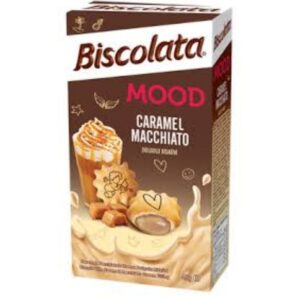 Biscolata Mood Caramel Macchiato Biscuits blend crisp biscuit shells with indulgent caramel macchiato cream filling. Each piece is stamped with playful icons like hearts, wings, and cupids, packed in a 40g box with bilingual labeling and coffee-themed visuals. Ideal for gifting kits, snack bundles, or impulse checkout displays.