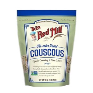 Bob?s Red Mill Tri-color Pearl Couscous is a vibrant blend of toasted semolina pearls with a delightfully nutty flavor and chewy texture. This quick-cooking, non-GMO couscous is a versatile alternative to pasta or rice ? perfect in salads, bowls, or topped with your favorite sauce. Packaged in a resealable 454g bag for freshness.