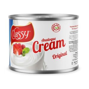 Classy Analogue Cream Original is a versatile dairy alternative manufactured from vegetable fat, designed to replace milk fat in whipping cream applications. Smooth and creamy in texture, it is ready to eat and ideal for desserts, toppings, and baking. The 155g can is a convenient size for households, offering flexibility for everyday recipes. Produced by Jumbo Masad Mixed Factory Co. Ltd. and made in the UAE, this product resonates with GCC and UAE consumers seeking affordable, plant-based pantry staples.
