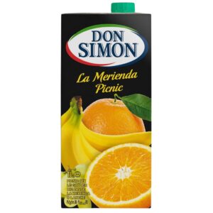 Don Simon La Merienda Picnic is a vibrant mixed fruit juice featuring banana, orange, and grape. This 1L carton is labeled in seven languages including Arabic, Spanish, French, and German, making it ideal for multicultural UAE retail. Perfect for breakfast kits, school lunchboxes, or impulse checkout.