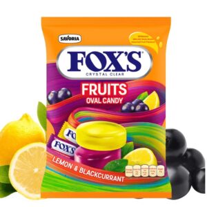 FOX?S Fruits Oval Candy ? Lemon & Blackcurrant delivers a vibrant blend of citrus and berry refreshment. These crystal-clear candies are halal-certified and made with assorted fruit essences for a cool, invigorating treat. Ideal for on-the-go refreshment, gifting, or sharing.