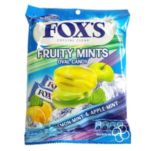 FOX?S Fruity Mints Oval Candy delivers a burst of freshness with its dual-flavor blend of lemon mint and apple mint. These crystal-clear candies are halal-certified and made with assorted fruit essences for a cool, invigorating treat. Ideal for on-the-go refreshment or sharing.