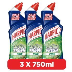Harpic Active Fresh Pine delivers powerful toilet cleaning with a refreshing pine scent. Its thick formula clings to surfaces, effectively removing limescale, rust, and grime while disinfecting. The angled nozzle ensures easy application under the rim. This 3-pack bundle offers excellent value for households seeking freshness and hygiene.