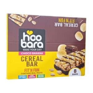 hoo bara Choco Banana Cereal Bars blend real banana with chocolate drizzle over whole grain oats for a satisfying snack. Each bar is packed with fiber, low in sodium, and part of the ?Fit?n Fun? range ? perfect for active lifestyles. The 8-bar pack features vibrant packaging with bilingual labeling and fruit-forward visuals. Ideal for breakfast kits, school lunchboxes, or wellness bundles.