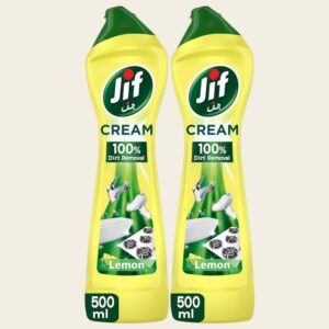 Jif Lemon Cleaning Cream delivers powerful 100% dirt removal with a fresh citrus scent. This special price promo pack includes two 500ml bottles, ideal for kitchens, bathrooms, and tough stains. Featuring bilingual Arabic-English labeling and Unilever’s promotional seal, it’s perfect for household bundles and impulse merchandising.