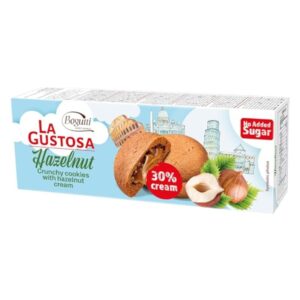 La Gustosa Hazelnut Crunchy Cookies feature a crisp biscuit shell filled with smooth hazelnut cream (30% cream). Made without added sugar and halal-certified, this 150g pack is ideal for dessert platters, gifting, or mindful snacking. The packaging showcases European landmarks and premium branding for shelf appeal.