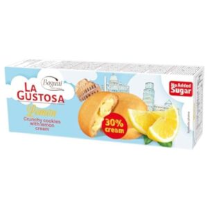 La Gustosa Lemon Crunchy Cookies blend crisp biscuit texture with a vibrant lemon cream center (30% cream). Made without added sugar and halal-certified, these 150g packs are ideal for dessert platters, gifting, or mindful snacking. The packaging features Italian-themed visuals and premium branding for shelf appeal.