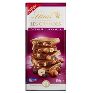 Lindt Les Grandes Milk Chocolate with 34% Hazelnut & Raisin is a luxurious Swiss chocolate bar made with whole hazelnuts and plump raisins. Crafted by Lindt & Spr?ngli chocolatiers since 1845, this 150g bar delivers rich texture and balanced sweetness in every bite. With elegant white and purple packaging and premium ingredient sourcing, it?s ideal for gifting or personal indulgence.