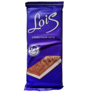 Lois Creamy Nougat is a soft, layered bar with a smooth white filling sandwiched between caramel-toned nougat layers. This 80g Russian import features Cyrillic labeling and a milk jug icon, highlighting its dairy-rich profile. Ideal for novelty snack bundles, impulse checkout displays, or international candy kits.
