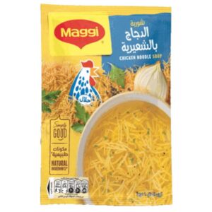 Maggi Chicken Noodle Soup blends tender noodles with savory chicken flavor and natural herbs for a comforting bowl in minutes. This 60g pack is halal-certified and part of Maggi?s ?Simply Good? range, made with natural ingredients and no added preservatives. Ideal for quick meals or light dinners.