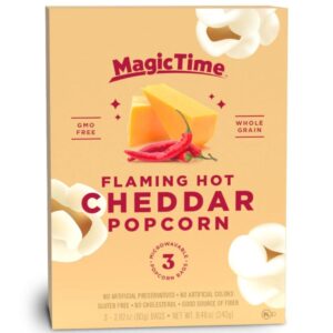 For optimal freshness, store Magic Time Flaming Hot Cheddar Popcorn in a cool, dry place away from direct sunlight. Once opened, reseal the package tightly to maintain crispiness for up to one week. The product has a long shelf life when stored properly, making it perfect for bulk grocery shopping and pantry stocking.