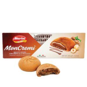 Marini MonCreme are premium Italian cookies filled with velvety hazelnut cream. Made in Verona, Italy, these 150g biscuits feature elegant packaging with dessert visuals and the Colosseum, emphasizing their artisanal origin. Ideal for coffee pairings, dessert bundles, or impulse checkout displays.
