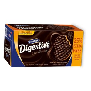 McVitie’s Digestive Dark Chocolate Biscuits combine the wholesome crunch of classic wheatmeal digestives with a smooth layer of rich dark chocolate. This 250g promotional pack offers 25% extra free, giving more value for the same price. Free from artificial colors and flavors, these biscuits deliver indulgence with quality ingredients. Perfect for tea time, snacking, or dessert bases, they balance heritage taste with modern appeal.