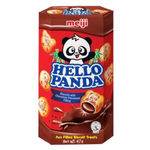 Meiji Hello Panda Biscuits are bite-sized treats filled with smooth chocolate cream and wrapped in a crisp biscuit shell. Each piece features playful panda prints, making them a hit with kids and nostalgic adults alike. This 47g box is ideal for lunchboxes, impulse snacking, or bundling into themed dessert packs. Packaged in a vibrant red carton with bilingual labeling and shelf-friendly appeal.