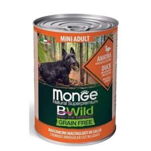 Monge BWild Grain Free Mini Adult Dog Food is formulated for small breed adult dogs, inspired by instinctive nutrition. This 400g can features a protein-rich recipe of duck with rabbit and vegetables, served as chunkies in gravy for taste and texture that dogs enjoy. Free from grains, it supports healthy digestion and balanced nutrition. Made in Italy, Monge delivers premium quality meals that combine natural ingredients with trusted expertise.