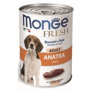 Monge Fresh Adult Dog Food offers authentic Italian quality with a recipe made from fresh duck. This 400g can features chunks in a loaf texture, combining tender pieces with pet’s for a balanced and tasty meal. Specially formulated for adult dogs, it provides protein, vitamins, and minerals to support daily nutrition. Made in Italy, Monge Fresh ensures wholesome ingredients and premium flavor in every serving.