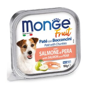 Monge Fruit Pat? with Chunkies blends tender salmon with juicy pear for a gourmet wet food experience tailored to adult dogs. This 100g tray is made in Italy and features a smooth pat? texture with real chunkies, ideal for picky eaters or rotational feeding. Free from cruelty testing and artificial additives, it?s perfect for premium pet bundles or wellness kits.
