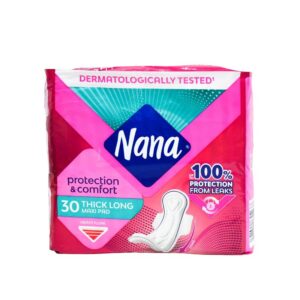 Nana Thick Long Maxi Pads are designed for heavy flow days, offering up to 100% leak protection and all-day comfort. Featuring V-Care? belts and V-Comfort fit, they adapt to your body?s movement ? whether sitting, standing, or bending. Dermatologically tested and wrapped in vibrant pink and green packaging, this 30-pad pack is ideal for daily use or bundling into personal care kits.