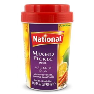 National Mixed Pickle in Oil is a bold, tangy condiment made with mango, lemon, carrot, and authentic spices, preserved in oil for rich flavor. A staple in South Asian cuisine, this pickle adds a zesty note to rice, curries, breads, and snacks. Produced with National’s trusted recipe, the 1kg jar offers a generous quantity for family use and long-lasting enjoyment. Its spicy kick and aromatic blend make it a versatile addition to everyday meals.