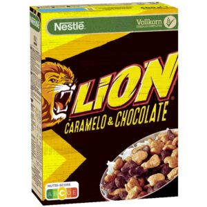 Nestlé Lion Caramel & Chocolate Cereal delivers bold flavor and texture in every bite. Made with whole grain as the number one ingredient, this 400g box features crunchy clusters coated in rich caramel and chocolate. Perfect for breakfast or snacking straight from the box. Nutri-Score C.
