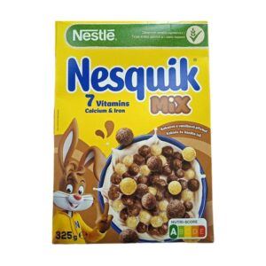 Nestle Nesquik Mix combines crunchy chocolate and vanilla cereal balls made with whole grains. Fortified with 7 essential vitamins, calcium, and iron, it’s a nutritious and fun breakfast option for kids and families. Rated Nutri-Score A and packed in a bright yellow box featuring the Nesquik bunny mascot. Ideal for breakfast bundles, school snack packs, and impulse buys.