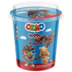 Ozmo Hoppo by ?lker features crunchy biscuits filled with smooth chocolate cream, each printed with playful animal designs like crabs and birds. This 90g pack comes in a bright blue wrapper with cartoon visuals and bilingual labeling. Perfect for kids? snack kits, novelty bundles, or impulse checkout displays.