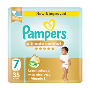 Pampers Ultimate Comfort Size 7 diapers are designed for toddlers weighing 15+ kg. This 35-count pack features x1000 Leaklocks for lasting dryness and lotion infused with Aloe Vera and Vitamin E for gentle skin protection. Ideal for active little ones.