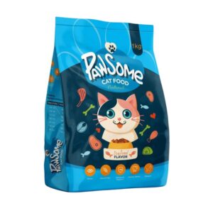 PawSome Natural Seafood Flavor Cat Food delivers balanced nutrition with a delicious seafood taste. Formulated with Omega 3 and 6 for skin and coat health, taurine for heart and eye support, and essential vitamins for digestive wellness, this 1kg bag is ideal for daily feeding. With 26% protein and no artificial additives, it?s a complete dry food solution for adult cats. Bright packaging and cartoon visuals add shelf appeal.