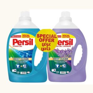 Persil Power Gel delivers hygienic deep cleaning with advanced stain-fighting technology. This special offer twin pack includes 2.9L bottles in Original and Lavender variants, ideal for laundry and washing machines. Labeled #1 on toughest stains, with bilingual Arabic-English packaging and Henkel branding. Perfect for family bundles, shelf merchandising, and impulse buys.