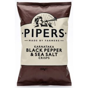 Pipers Karnataka Black Pepper & Sea Salt Crisps deliver a robust flavor experience with the perfect balance of heat and salt. Made by farmers and hand-cooked for authentic crunch, these crisps highlight the distinctive taste of Karnataka black pepper paired with natural sea salt. The 150g pack is ideal for sharing, entertaining, or enjoying as a premium snack. Pipers crisps are known for their artisanal quality and bold seasoning, making them a standout choice for crisp lovers.