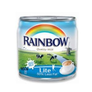 Rainbow Quality Milk Lite is a creamy evaporated milk made from fresh cow?s milk, now with 50% less fat. This 160g can features a pastoral scene with cows, a stream, and a windmill, plus bilingual labeling in English and Arabic. Ideal for coffee, tea, desserts, and light cooking. Perfect for pantry kits, breakfast bundles, or impulse checkout displays.