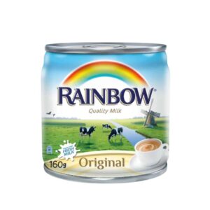 Rainbow Quality Milk Original is a rich, creamy evaporated milk made from fresh cow?s milk. This 160g can features a colorful rainbow over a pastoral scene with cows, a stream, and a windmill, plus bilingual labeling in English and Arabic. Ideal for coffee, tea, desserts, and cooking. Perfect for pantry kits, breakfast bundles, or impulse checkout displays.