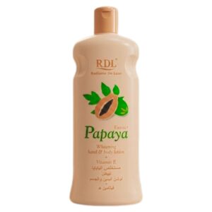 RDL Radiant De Luxe Papaya Extract Whitening Hand & Body Lotion is enriched with natural papaya extract and Vitamin E to help brighten, moisturize, and protect skin. Its lightweight formula absorbs quickly, leaving skin soft, smooth, and radiant. Ideal for daily use, this lotion combines whitening benefits with nourishing hydration, making it suitable for hands and body. Packed in a 600ml bottle, it offers long-lasting care for healthy, glowing skin.