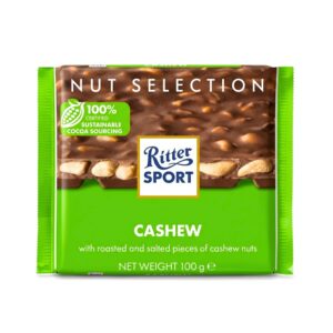 Ritter Sport Milk Chocolate with Cashew from the Nut Selection range combines smooth German milk chocolate with whole cashew nuts for a rich, crunchy indulgence. Crafted with 100% certified sustainable cocoa sourcing, it delivers premium taste with ethical responsibility. This 100g bar, with Ritter Sport’s iconic square design, is perfect for sharing, gifting, or enjoying as a personal treat. Made in Germany with trusted quality, Ritter Sport offers a chocolate experience that balances creaminess, crunch, and sustainability.