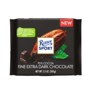 Ritter Sport Fine Extra Dark Chocolate 70% is a premium chocolate bar crafted with fine cocoa from Ritter’s own sustainable farm. This 100g bar delivers a rich, intense flavor with a smooth texture, ideal for gifting, dessert kits, or impulse checkout. Made in Germany and widely stocked across UAE supermarkets.