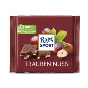 Ritter Sport Trauben Nuss combines juicy raisins with crunchy hazelnuts, all enveloped in smooth milk chocolate. This classic German variety delivers a rich, fruity, nutty flavor profile that has made it a favorite worldwide. Crafted with 100% certified sustainable cocoa, the 100g bar reflects Ritter Sport’s commitment to quality and responsibility. The maroon packaging highlights its indulgent character, making it perfect for gifting, sharing, or enjoying as a personal treat.