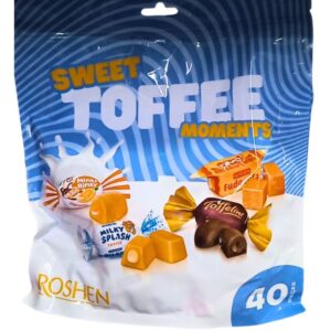 Roshen Sweet Toffee Moments is a vibrant assortment of 40 individually wrapped toffee candies, including Milky Splash, Minky Binky, Toffee Choc, and Fudge. This 359g pack offers creamy, chewy, and chocolate-filled textures in one shareable pouch. Ideal for party bowls, gifting, or impulse checkout. Made in Ukraine and stocked across UAE supermarkets.