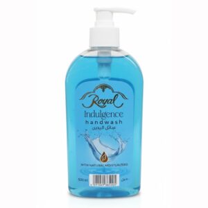Royal Indulgence Handwash offers a refreshing cleanse with natural moisturizers and a crisp aquatic fragrance. Packaged in a clear 500ml pump bottle with blue liquid and bilingual Arabic-English labeling, it’s ideal for daily hygiene, bathroom merchandising, and bundle packs. The water splash motif and droplet icon reinforce its hydrating appeal.