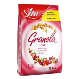 Sante Granola Fruit is a wholesome breakfast blend made with crunchy oat clusters and a mix of strawberry, cranberry, and cherry pieces. High in fibre and free from glucose-fructose syrup or added wheat, it offers a nutritious start to the day with natural sweetness and fruity flavor. Perfect with milk, yogurt, or as a snack on its own, this 350g pack delivers both taste and health benefits.