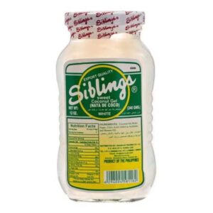 Siblings Sweet Coconut Gel (Nata de Coco) White is a chewy, translucent dessert made from real coconut gel. This 340g jar offers export-quality freshness with no fat or cholesterol, and is lightly flavored with banana oil for a tropical finish. Manufactured in the Philippines and distributed in the UAE, it?s perfect for fruit salads, chilled desserts, or direct snacking.