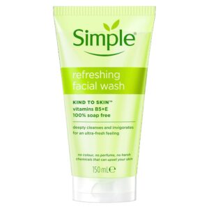 Simple Refreshing Facial Wash is designed to deeply cleanse and invigorate the skin without harsh chemicals. Enriched with vitamins B5 and E, this 100% soap free formula is kind to skin, leaving it feeling fresh and revived. Free from color, perfume, and irritants, it’s suitable for sensitive skin and daily use. Dermatologist tested, this 150mL facial wash provides a gentle yet effective cleansing experience.