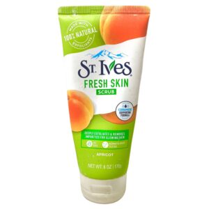 St. Ives Fresh Skin Apricot Scrub is a deep exfoliating face wash made with 100% natural exfoliants and a ceramide-supporting formula. It removes impurities and dead skin cells for a radiant glow. Dermatologist-tested and oil-free, this scrub is ideal for weekly skincare routines and bundle merchandising. Packaged in a vibrant green-white tube with apricot visuals.
