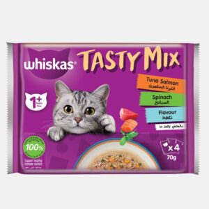Whiskas Tasty Mix combines tender chunks of tuna, salmon, and spinach in a savory jelly, crafted for adult cats aged 1 year and above. Each 70g pouch delivers 100% complete and balanced nutrition with immune system support. Featuring bilingual Arabic-English labeling and impulse-friendly visuals, this 4-pack is ideal for bundling with pet care essentials or seasonal promotions.
