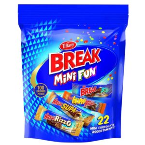 Tiffany BREAK Mini Fun is a vibrant assortment of 22 individually wrapped chocolate bars, each offering a unique texture and flavor. Includes BREAK (milk chocolate wafer), Happy BREAK, BREAK SUPA, and BREAK RizzO (white chocolate wafer). Each bar is portioned at 100 calories, making it ideal for sharing, gifting, or bundling into impulse snack packs. Packaged in a bold blue pouch with playful branding and bilingual labeling.