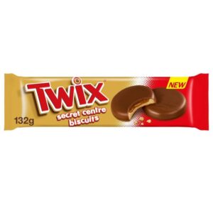 Twix Secret Centre Biscuits bring the iconic Twix experience into a biscuit format. Each bite features a crisp biscuit shell with a hidden caramel and chocolate centre, delivering layered indulgence in every crunch. Perfect for snacking, sharing, or pairing with coffee. Packaged in a gold pouch with 132g of deliciousness.