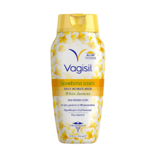 Vagisil?Scentsitive?Scentsô Daily Intimate Wash ñ?White?Jasmine (354?ml) is a specially formulated feminine hygiene wash offering gentle cleansing combined with a delicate floral aroma. Free from dyes, parabens, and MIT preservatives, the pH-balanced, hypoallergenic formula is gynecologist- and dermatologist-tested to ensure safety and comfort for sensitive skin