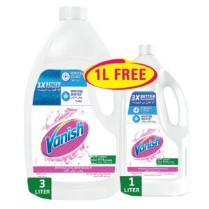 Vanish Fabric Stain Remover delivers powerful cleaning performance, proven to be 3X better than bleach at removing stains while keeping fabrics safe. It whitens whites, eliminates 99.9% of germs, and works without chlorine bleach. This promotional pack includes a 3L bottle plus an additional 1L at no cost, offering great value for households. With bilingual packaging (English & Arabic), Vanish resonates strongly with GCC and UAE consumers seeking trusted laundry care solutions.